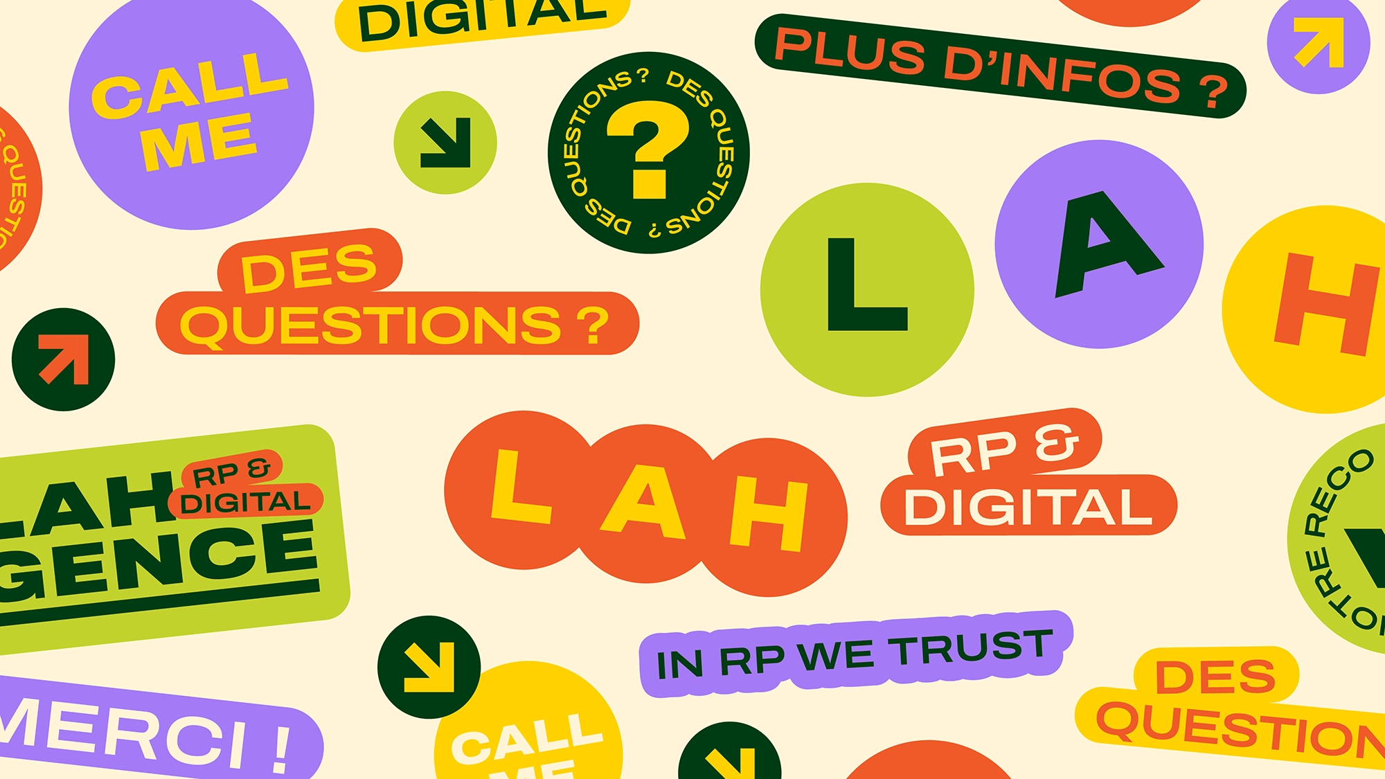 Le logotype, construit autour des initiales LAH, garantit une reconnaissance immédiate. Une version secondaire inclut les expertises du studio : RP et digital.
